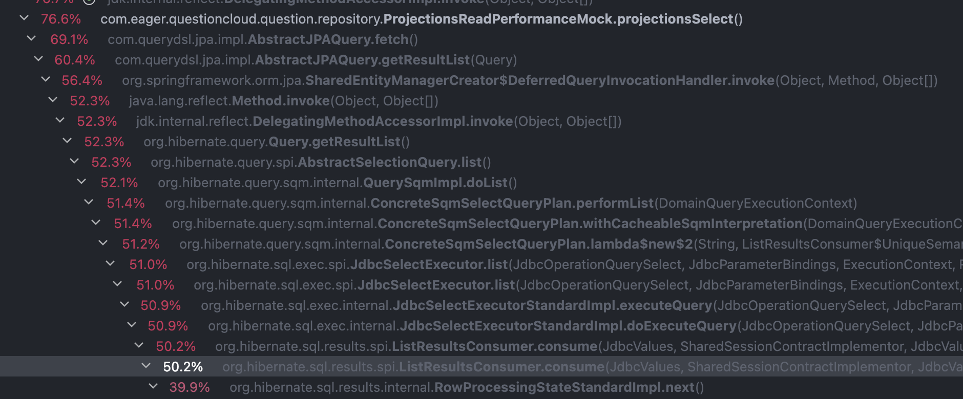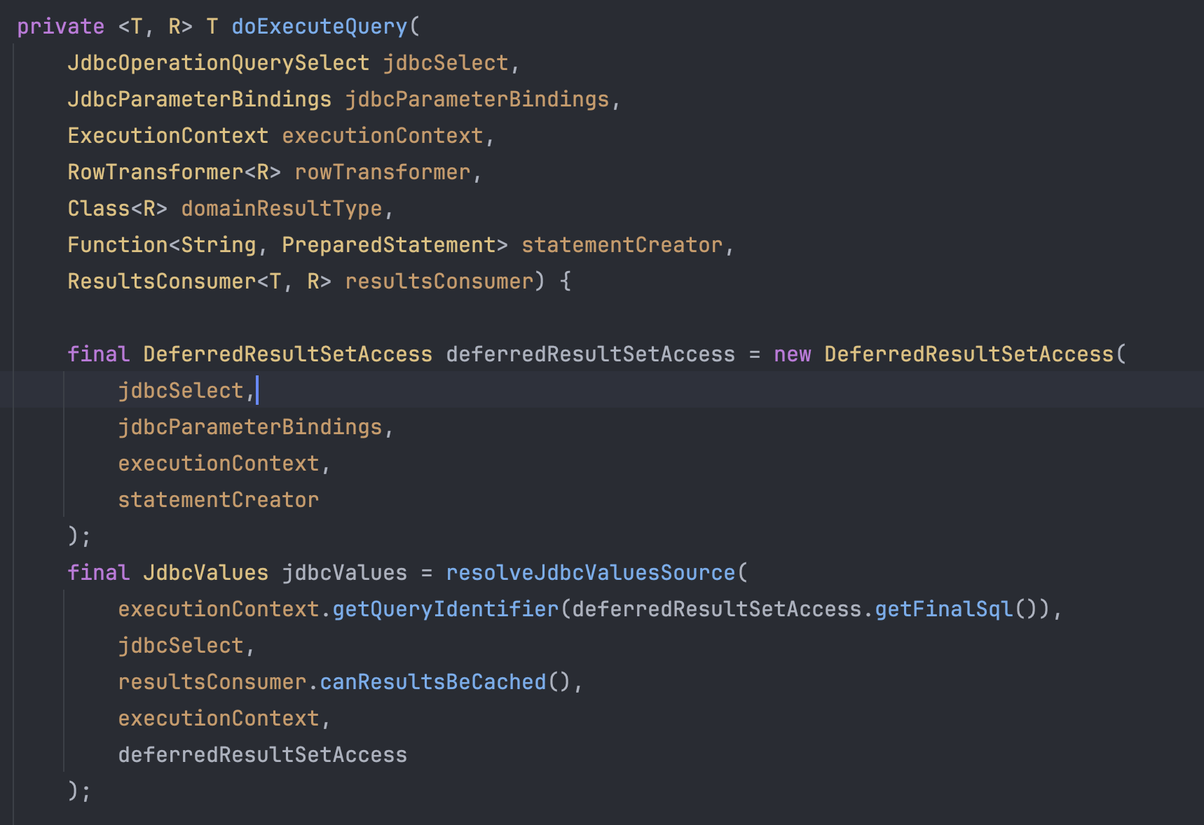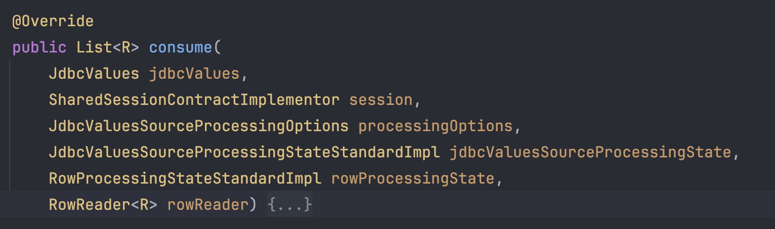 이 consume 메서드가 최종적으로 JDBC에 SQL을 요청하고, 필요로 하다면 Entity로 매핑까지 처리하는 메서드이다.