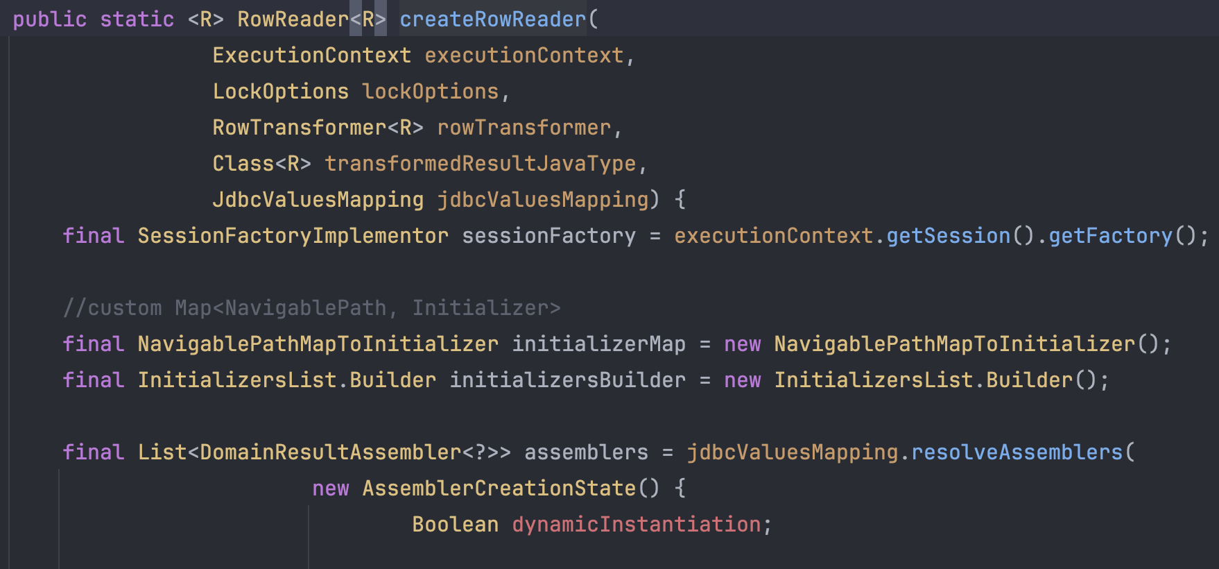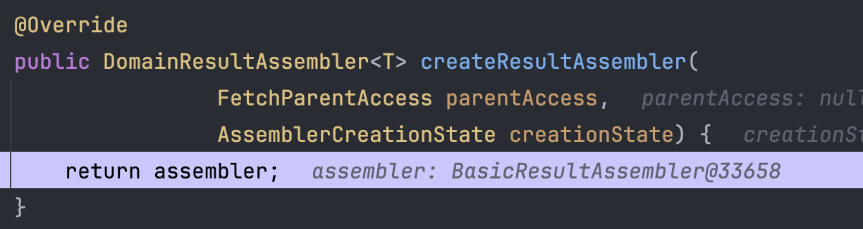 위 코드는 EntityResultImpl의 createResultAssembler의 메서드이다. EntityAssembler라는 객체를 만들어주는 것을 볼 수있다.