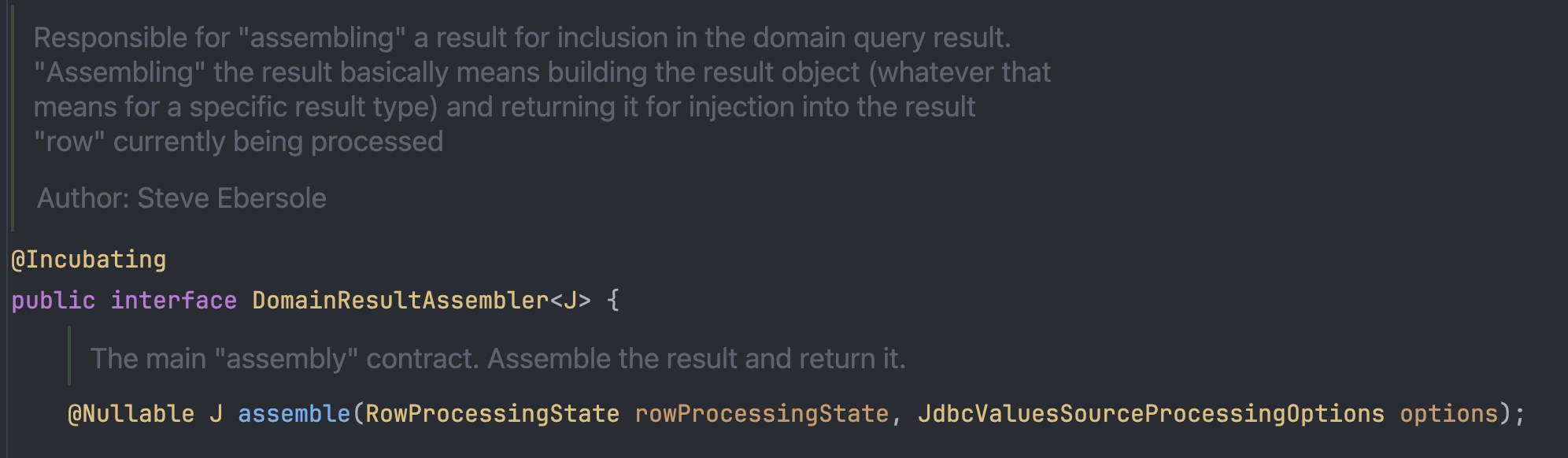 DomainResultAssembler는 인터페이스인데 주석을 읽어보면 SQL 결과로부터 데이터를 뽑아내고 조립하는 역할이라고 한다.