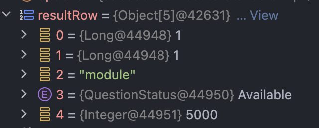 ResultSet으로부터 뽑아온 데이터인 values를 디버거로 확인해보면 실제로 채워야 할 5개의 데이터가 담아져있음을 볼 수 있다.