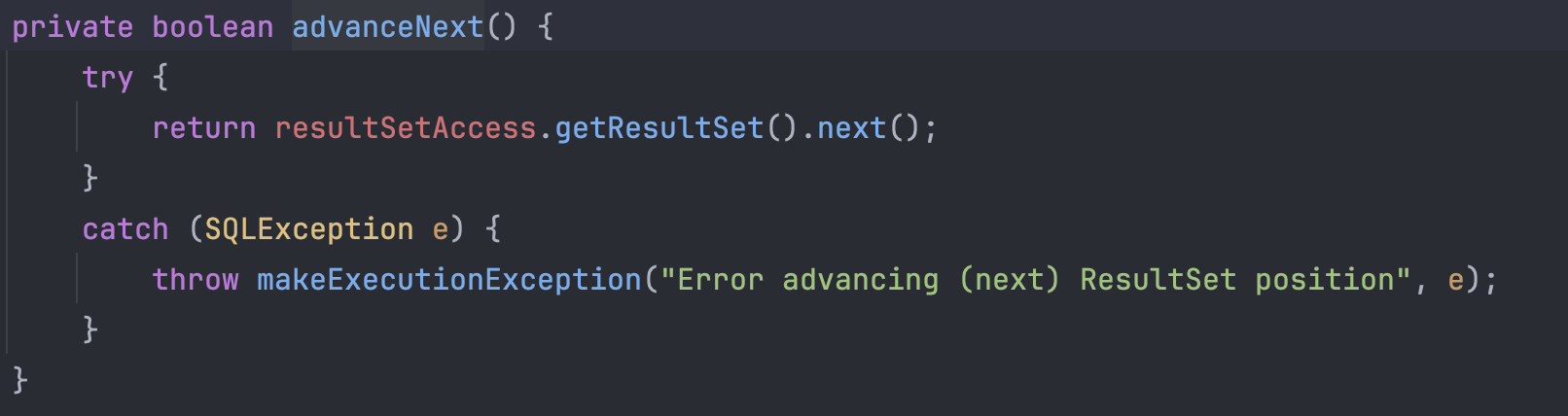 재밌는 건 next 메서드를 디버깅하면서 쭉 따라가면 위에서 만들었던 JdbcValues의 advanceNext를 만나게 되고 여기서DeferredResultSetAccess에 접근하게 된다.